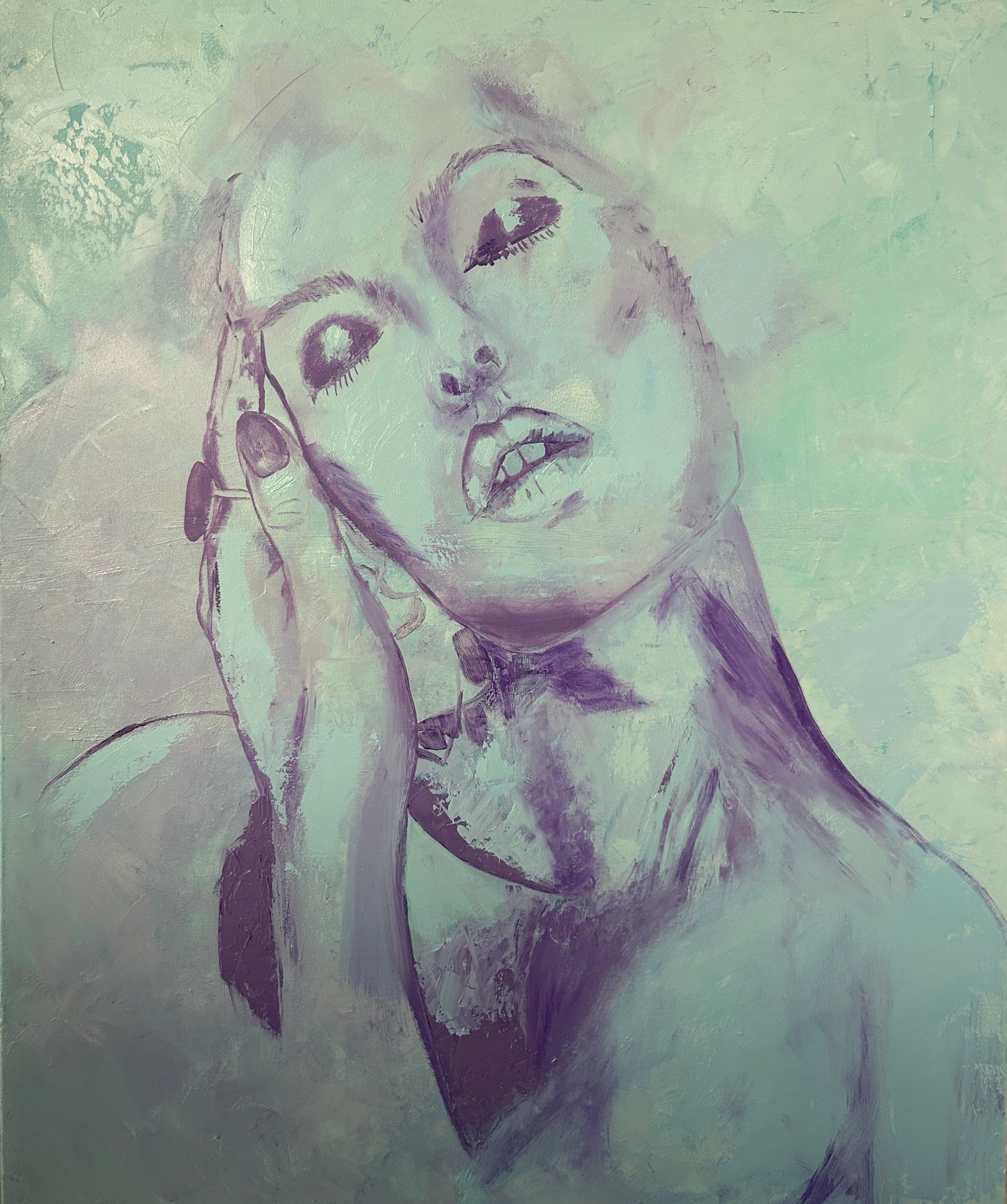 • Intense Expression: The central female figure, with her piercing gaze and a hand delicately touching her temple, radiates a sense of contemplation and ethereal strength. It is a study of fleeting emotion and feminine sensitivity.