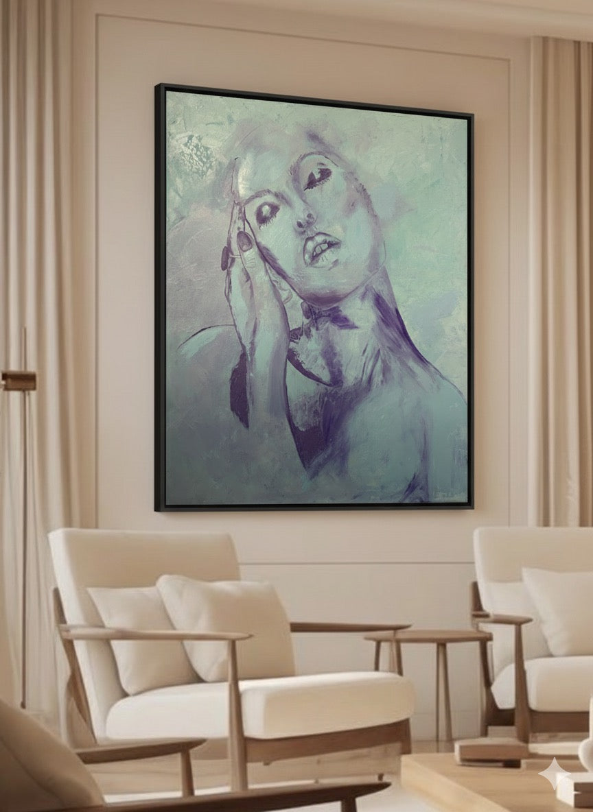 This mesmerizing painting, executed in a cool palette of mint green, blue, and deep violet, is not just a decoration—it is a portal to an inner world. It is painted with a distinctive, almost sculptural texture that comes alive under different lighting.