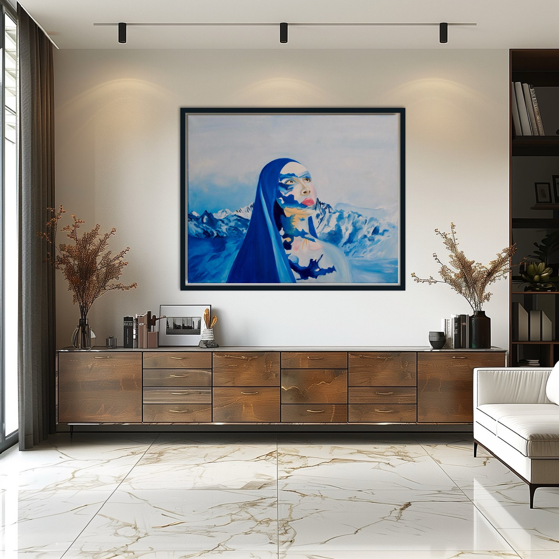 This evocative portrayal transforms the vibrant makeup into an empowering symbol, reflecting the marks of challenges conquered. With an unwavering gaze fixed on the future, the colossal mountains become a source of strength and hope, offering a backdrop that echoes her journey towards renewal.