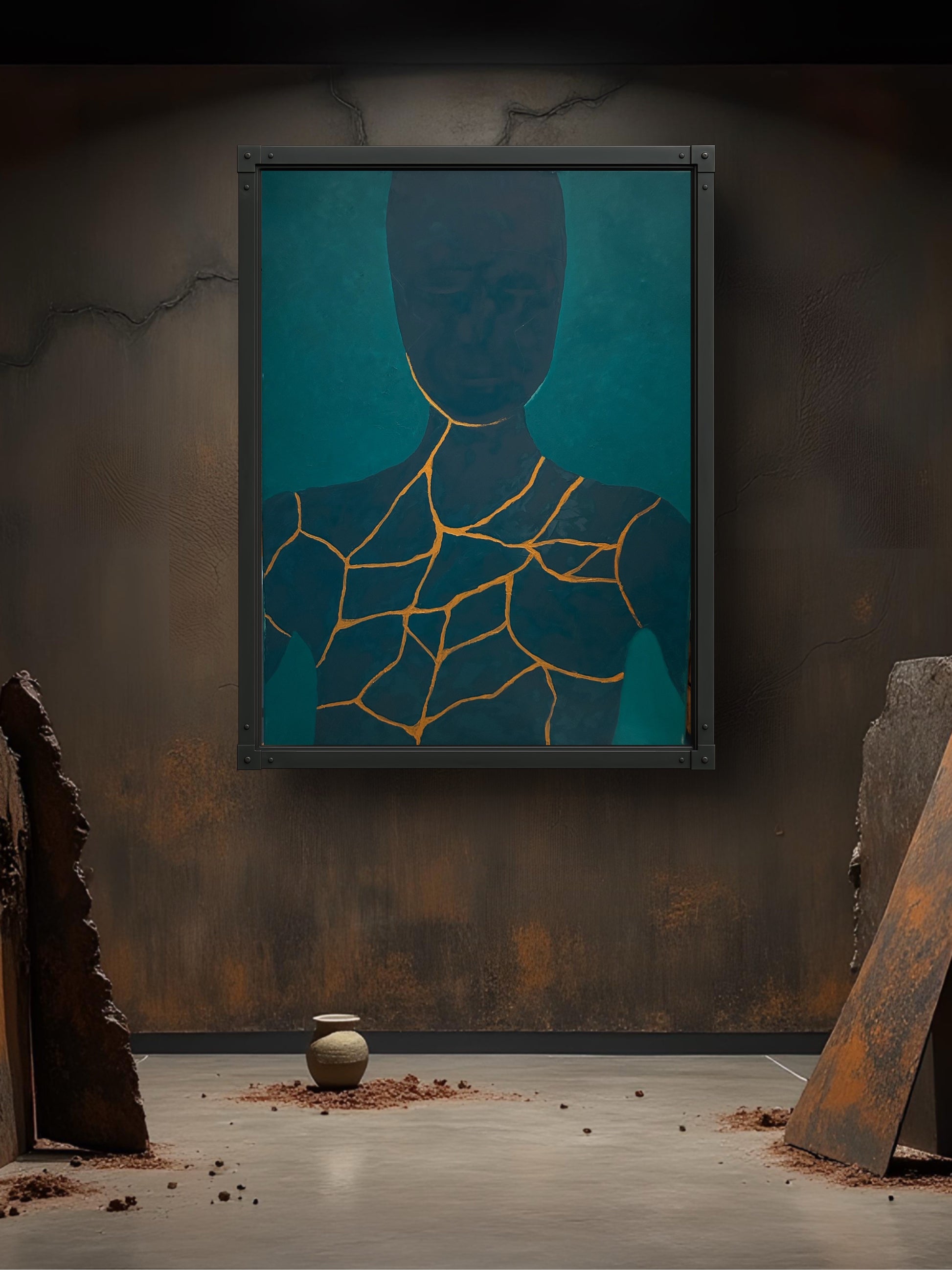 Inspired by the Japanese art of Kintsugi (golden joinery), where broken pottery is mended with lacquer dusted with gold, the artwork transforms the cracks into marks of history, perseverance, and uniqueness. What might initially be seen as damage becomes the most precious part of the piece.